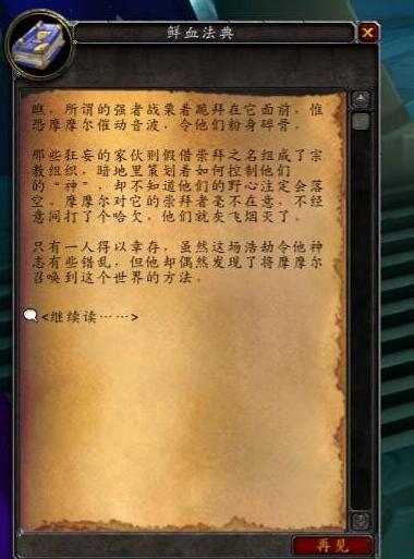 当音之元素在奥金顿成实体摩摩尔的时候,整个奥金顿被轰的四分五裂,在场的人几乎全部丧命,巨大的冲击波冲出了奥金顿,把泰罗卡森林几乎夷为平地,就是后来的白骨荒野。在奥金顿的暗影迷宫中,有一本鲜血法典,我们再来看看这本书对摩摩尔的描述。中间省略了一些……